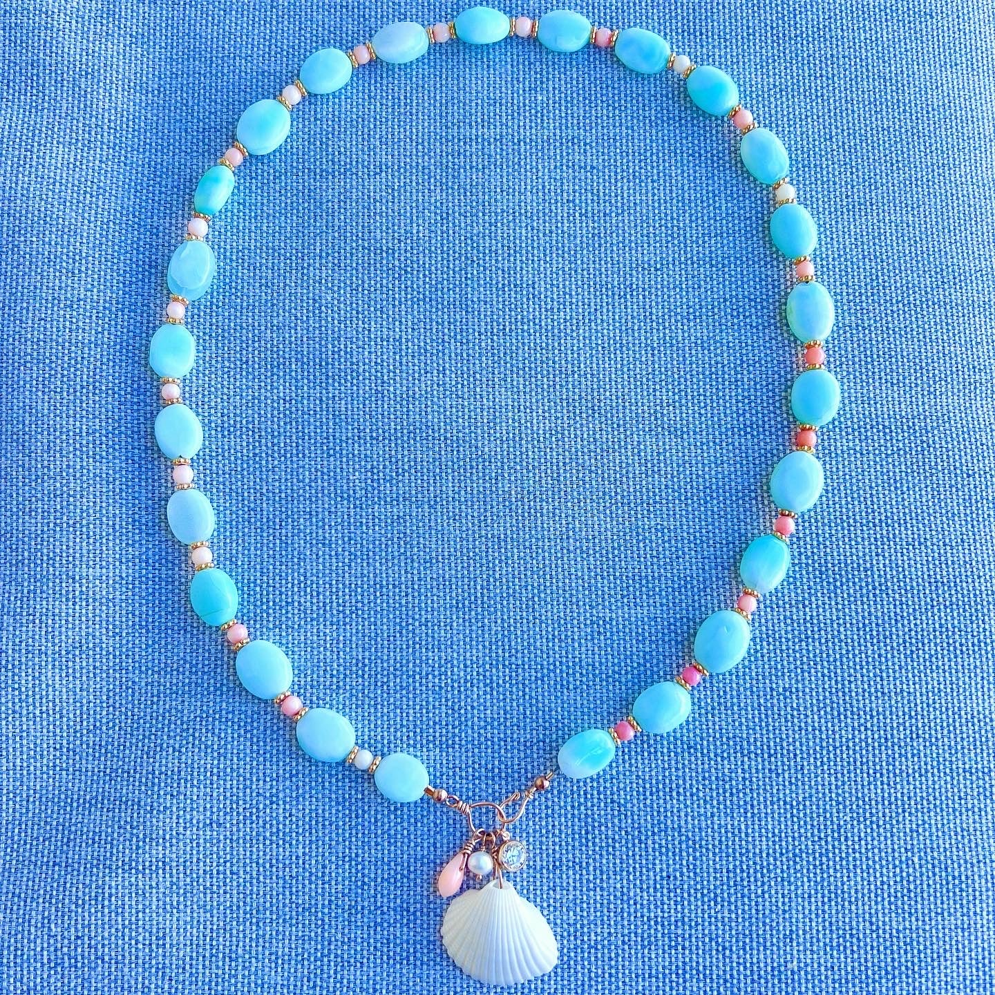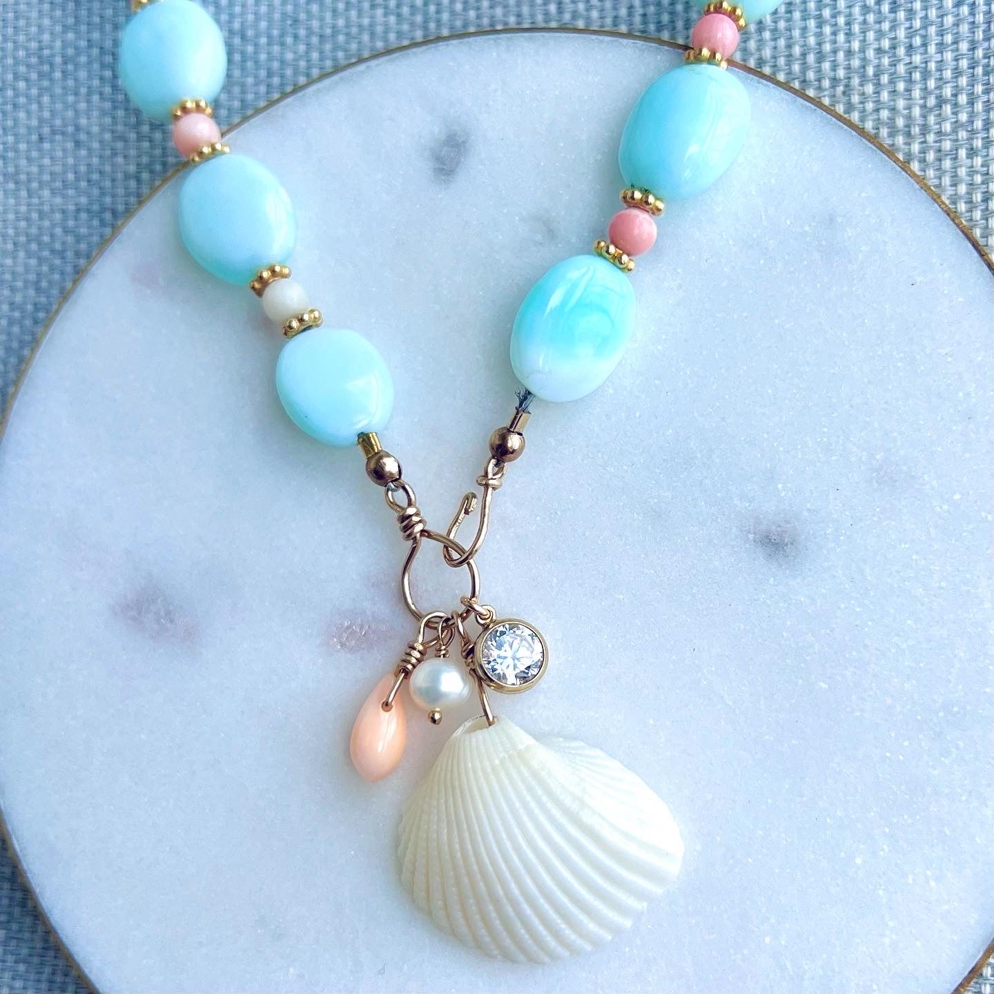This bright, fun piece is perfect for summer! Beautiful blue Peruvian opal and peachy pink coral stones come together with a 14k gold filled hook & eye closure that holds a collection of charms including a coral teardrop, a white pearl, a sparkling cubic zirconia stone, and an ivory seashell from the beach in Jupiter, FL. A one of a kind statement necklace.